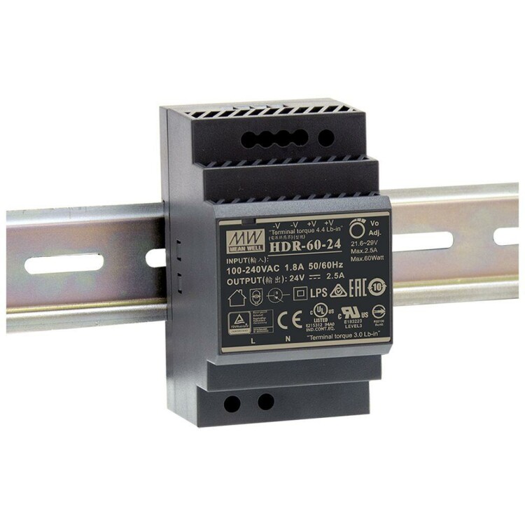 Источник питания со стабилизированным выходным напряжением 24В совместим со светодиодной лентой, устанавливается на DIN-рейку. Подходит для светодиодного освещения зданий, архитектурной и интерьерной подсветки.