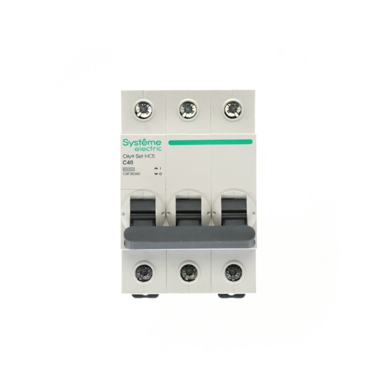 Автоматический выключатель серии City9 Set Systeme Electric, 3-полюсный, номинальный ток 40 А, характеристика С, Icn = 6 кА. Применяется в электрических сетях напряжением 400 В. Предназначен для защиты от перегрузок и токов короткого замыкания. Оснащен механизмом «мгновенной коммутации». Ударопрочный корпус из специального пластика с 6 металлическими заклепками. Безопасные клеммы исключают попа дание кабелей в заклеммное пространство.