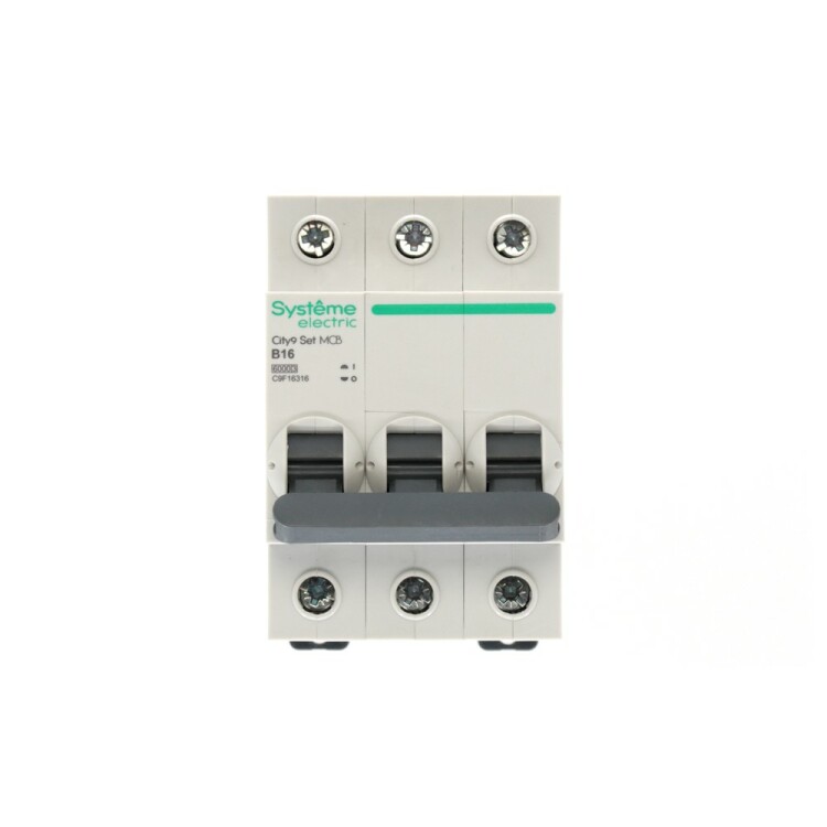 Автоматический выключатель серии City9 Set Systeme Electric, 3-полюсный, номинальный ток 16 А, характеристика B, Icn = 6 кА. Применяется в электрических сетях напряжением 400 В. Предназначен для защиты от перегрузок и токов короткого замыкания. Оснащен механизмом «мгновенной коммутации». Ударопрочный корпус из специального пластика с 6 металлическими заклепками. Безопасные клеммы исключают попадание кабелей в заклеммное пространство.