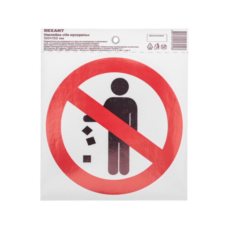 Наклейка запрещающий знак «Не мусорить» d-150 мм REXANT (кр. 10 шт)