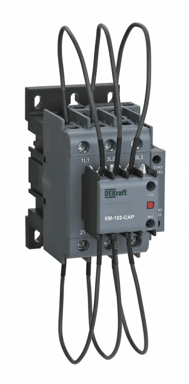 Контактор конденсаторный серии КМ-102-CAP DEKraft предназначен для замыкания и размыкания электрических цепей батарей конденсаторов; 3P; номинальная мощность 60 кВАр; напряжение управления 220/230 В пер.тока; доп.контакты 1НО + 2НЗ; установка на стандартную DIN-рейку. Контакторы КМ-102-CAP предназначены для использования в установках и щитах компенсации реактивной мощности (КРМ) централизовано на объектах или непосредственно у потребителей с низким коэффициентом мощности.