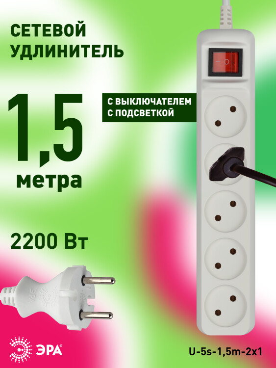 Удлинитель электрический Эра U-5s-1,5m-2x1 без заземления, c выключателем, 5 розеток, 1,5м ПВС 2x1мм2. Рассчитан на максимальную мощность 10А/2200. Удлинитель Эра станет Вашим надежным помощником, если Ваши любимые электроприборы находятся далеко от розеток. Провод в удлинителях Эра сделан из 100% меди, что делает его абсолютно пожаробезопасным. Корпус выполнен из ударопрочного и негорючего пластика (полипропилен). Модель удлинителя на 10А позволяет подключить бытовые приборы общей нагрузкой до 2200Вт. Дизайн удлинителя разработан в России командой Эра Style.