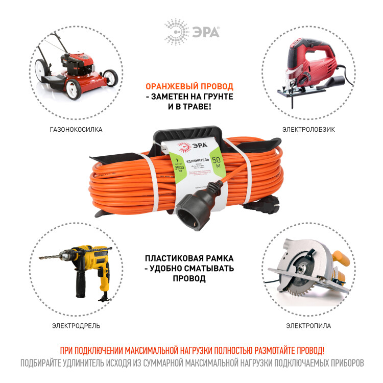 Удлинитель силовой на рамке UFx-1e-3x1.5-50m с заземлением, ПВС 3x1,5м2, 1 розетка, 50м, степень защиты IP20. Мощность 16А/3500Вт. Используется для работы на строительных площадках или дачных участках. Удобен при работе с приборами находящимися удаленно от стационарной розетки. Например, газонокосилки, электрические, пилы, триммеры или электродрели. Провод в удлинителях Эра сделан из 100% меди, что де лает его абсолютно пожаробезопасным. Рама-полипропилен.