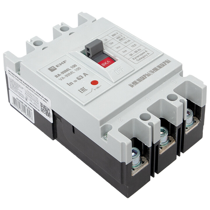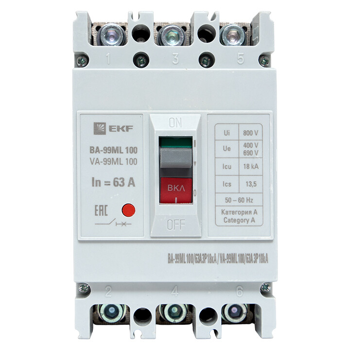 Выключатель ВА-99 выполнен в виде моноблока и состоит из основания и крышки с фальшпанелью, в которой имеется окно для рукоятки управления и толкатель кнопки «Тест» - проверки механизма отключения выключателя. Основание выполнено из термостойкой пластмассы, не поддерживающей горение и являющейся несущей конструкцией для присоединительных зажимов, неподвижных и подвижных контактов с системой дугогашения, механизма управления, блока защиты от сверхтоков. Крышка закрывает все подвижные элементы механизма управления и внутренние токоведущие части.