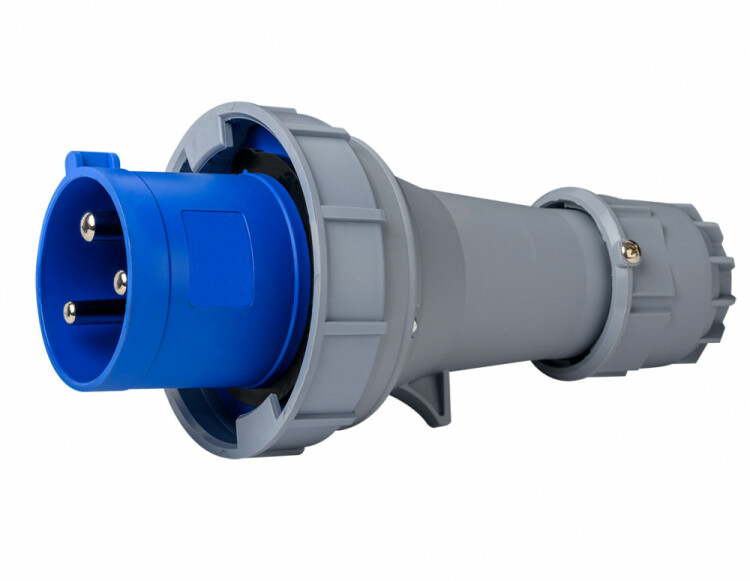 Вилка переносная серии ВП-103 Dekraft, номинальный ток 63 А, диапазон рабочего напряжения 200-250 В AC, степень пыле-влаго защиты IP67, количество полюсов 2Р+РЕ, код CEE 033W.