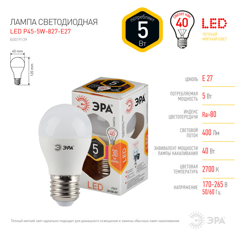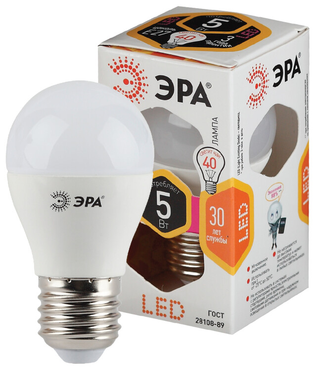 LED P45-5W-827-E27 ЭРА (диод, шар, 5Вт, тепл, E27) (6/60/2400) (кр.1шт)