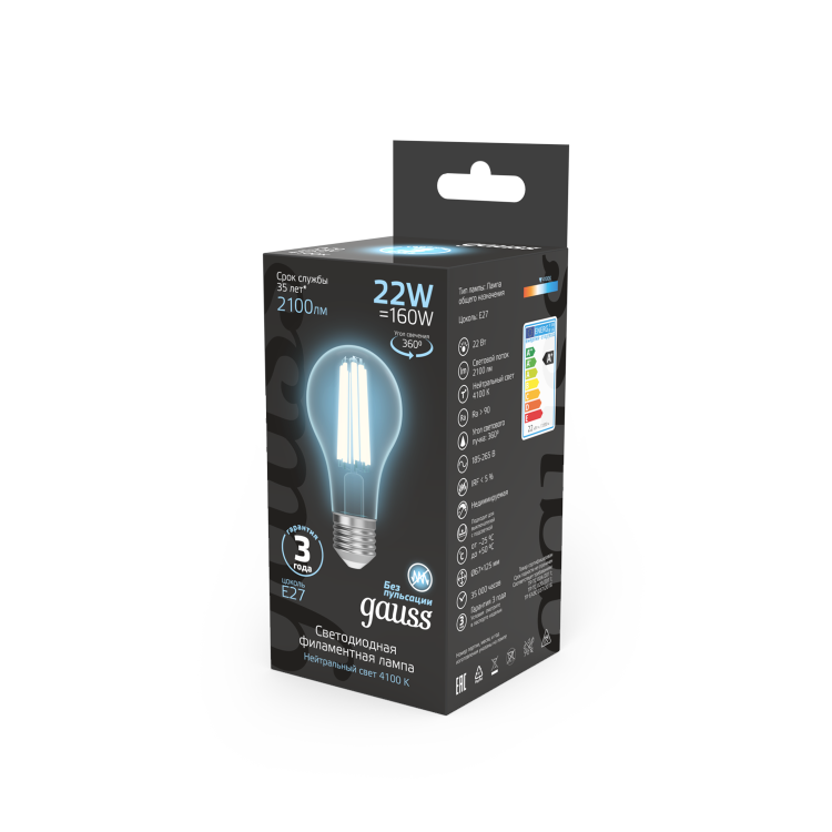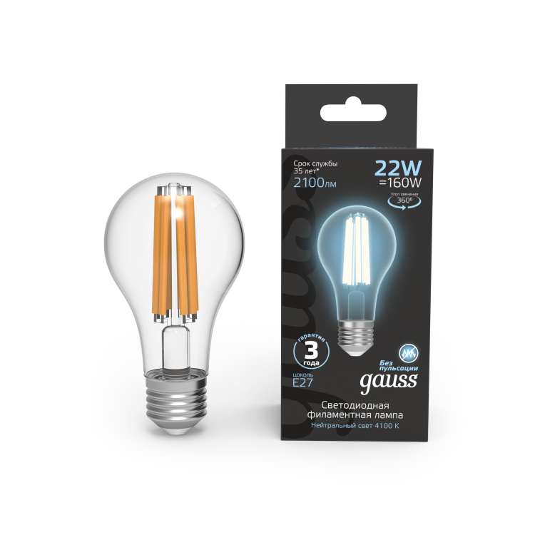 Лампа Gauss Filament А70 22W 2100lm 4100К Е27 LED 1/10/40