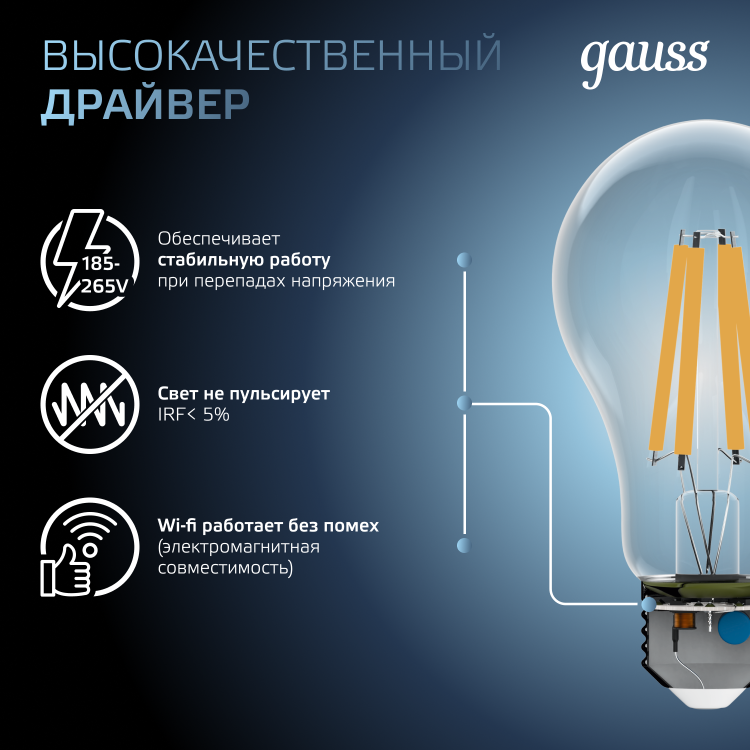 Светодиодные филаментные лампы GAUSS - это новейшие технологии в светотехнике. Лампы имеют привычный вид классических ламп накаливания, освещают пространство на 360о и дают больше света по сравнению с обычными светодиодными лампами за счет прозрачной колбы. Идеально подходят для хрустальных люстр и открытых светильников, а также для реализации дизайнерских решений, где важен вид классических ламп накаливания.