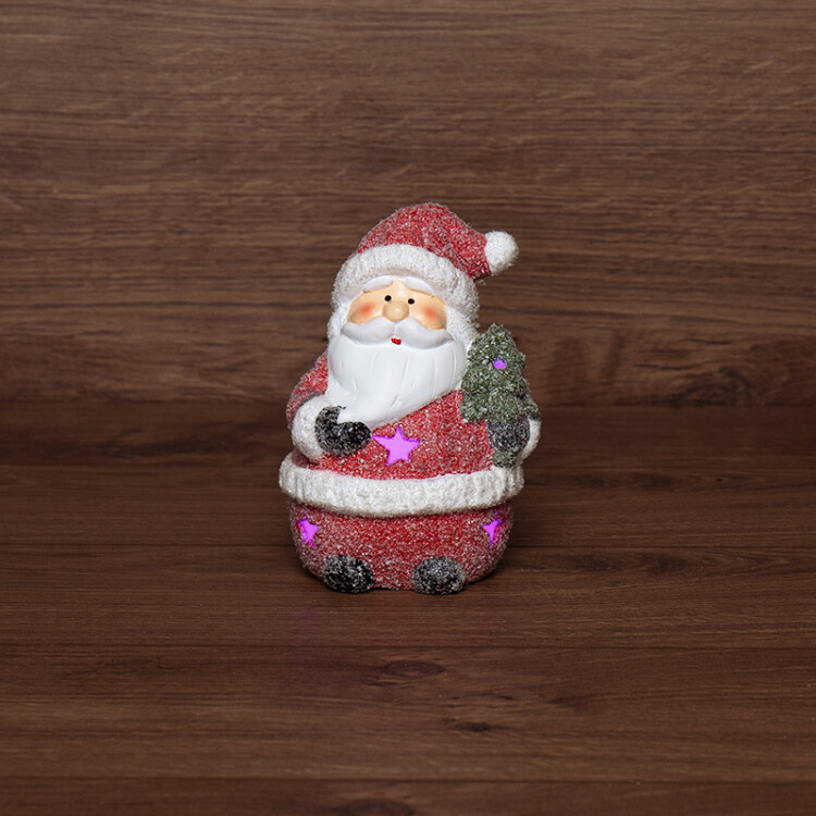 Керамическая фигурка "Дед Мороз с елочкой" 10.7x9.2x15.4 см - интересное решение для оформления интерьера, которое поможет создать атмосферу зимней сказки в вашем доме. Милая композиция с добрым Дедушкой Морозом, держащим новогоднюю елочку, эффектно подсвечивается 1 диодом RGB, который светится разными цветами. Изделие не требует подключения к электрической сети, поэтому его можно разместить в любом месте. В качестве элементов питания используются 2 батарейки типа LR44, которые вxодят в комплект.