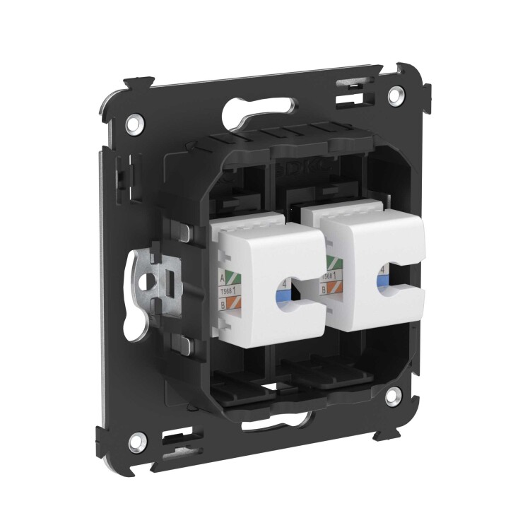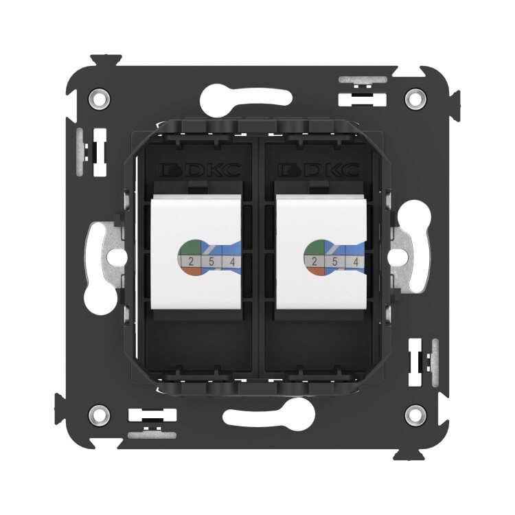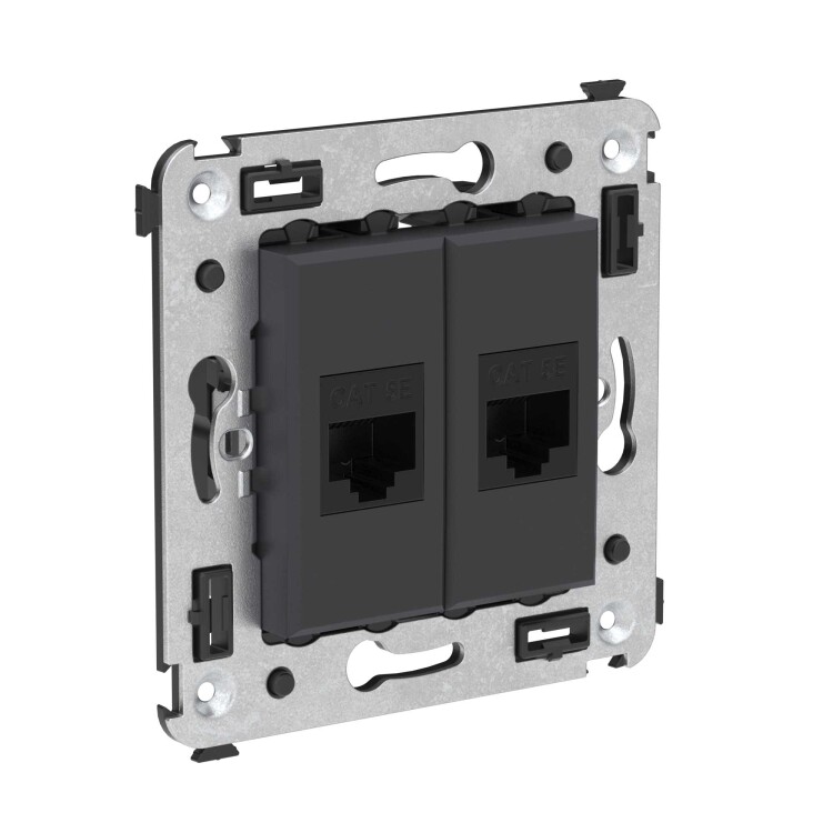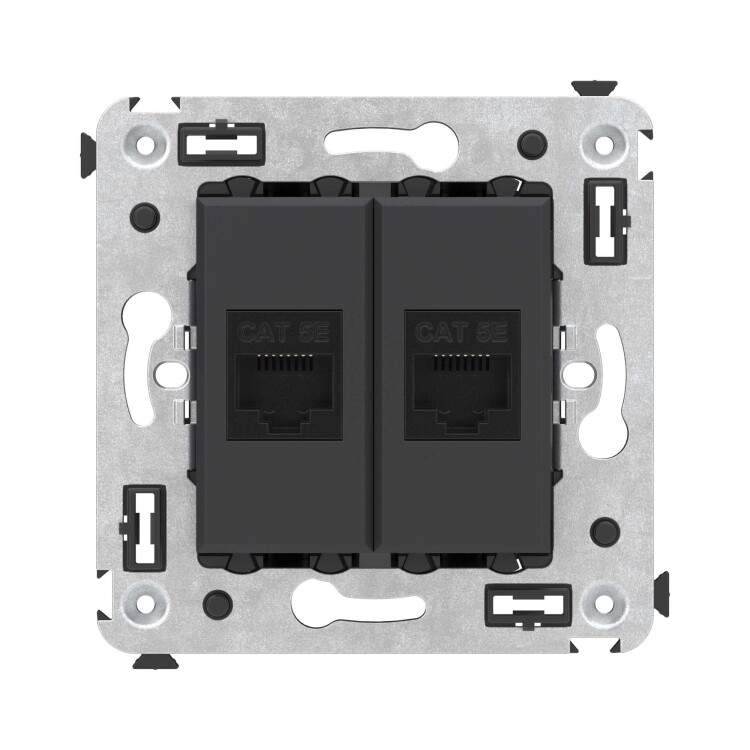 Компью терная розетка двойная без шторки используется для подключения компьютерной техники и соединения с патч-панелью. Компьютерная розетка предназначена для скрытого монтажа в стену, поставляется в комплекте с суппортом. Розетка RJ-45 категории 5e – это наиболее популярная на сегодняшний день модель. Она позволяет организовать сеть с частотой 125 МГц и скоростью до 1000 Мбит/с. Материал – металл, термопласт. Пластиковые детали устройства имеют оттенок "Черный матовый".