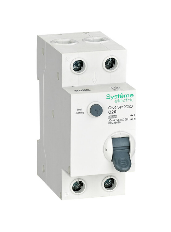 Автоматические выключатели дифференциального тока (АВДТ) серии City9 Set Systeme Electric,1P+N, номинальный ток 20 А, характеристика С, Icn = 6 кА, ток утечки 30 мА, тип АС. АВДТ применяется в электрических сетях напряжением 230В. Предназначен для защиты сети от перегрузок, людей от поражения электрическим током и токов короткого замыкания. Уставка по току утечки 30 мА обеспечивает гарантированную защиту людей при прямом прикосновении. Кнопка тест обеспечивает проверку работоспособности аппарата. Крепление на DIN-рейку шириной 35 мм. Безопасные клеммы