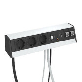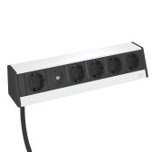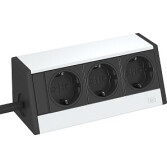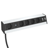 Настольный бокс DB укомплектованный (3 розетки 220В Schuko 2К+З черного цвета, 2 розетки RJ45 категория 6 экранированные (муфты, соединение 1:1), с сетевым кабелем 3 м, кабельный вывод с нижней стороны) без крепления, 235х73х70 мм, алюминий, серебристыйDB